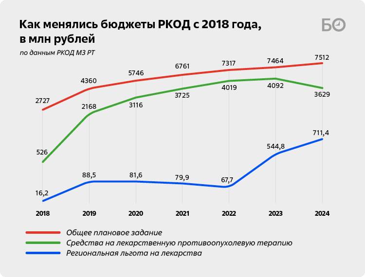 Есть и другие примеры, буквально под боком РТ, например Башкортостан. В раковом регистре РБ — около 105 тыс. пациентов. Да, в республике тоже говорят о тенденции к снижению финансирования онкодиспансера, но внимание на цифры: в 2024 году бюджет башкирского РКОД составил 7,3 млрд рублей, а лекарственное обеспечение — 3,8 млрд рублей против татарстанских 711 миллионов.