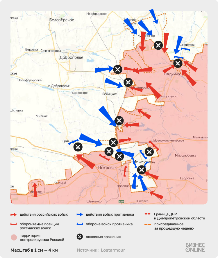 Так, в районе Покровского ВС РФ заняли населенные пункты Отрадное, Волчье и Тихое, продвинувшись на 3–5 километров.