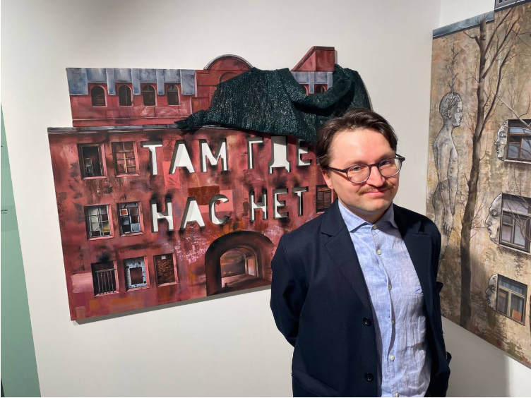 Казанский стенд посетил и знаменитый российский уличный художник Владимир Абих — лауреат премии им. Сергея Курехина, чьи работы находятся в коллекциях Русского музея, ММОМА, Музея АZ. На фотографии он позирует на фоне своего совместного произведения с Динарой Хёртнагль.