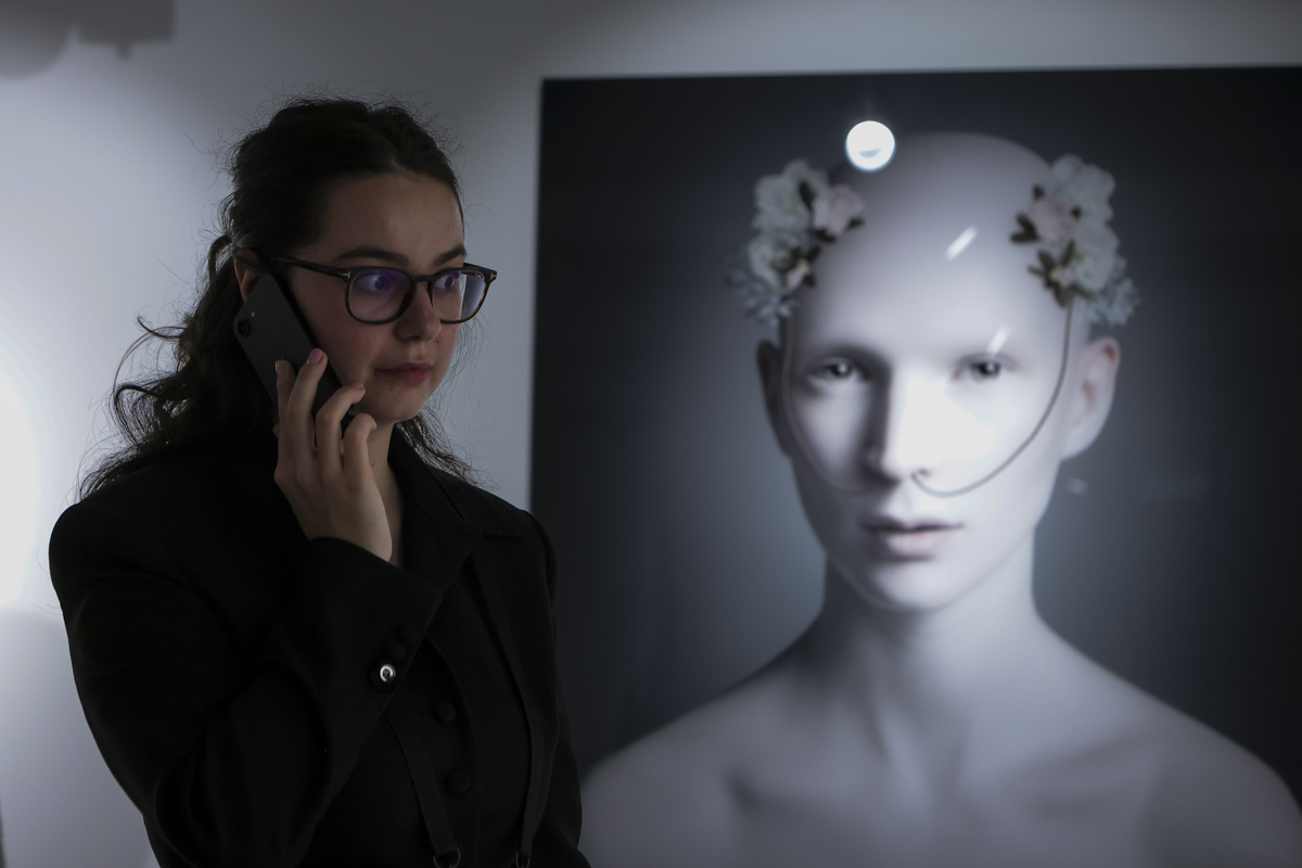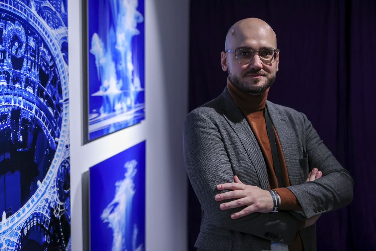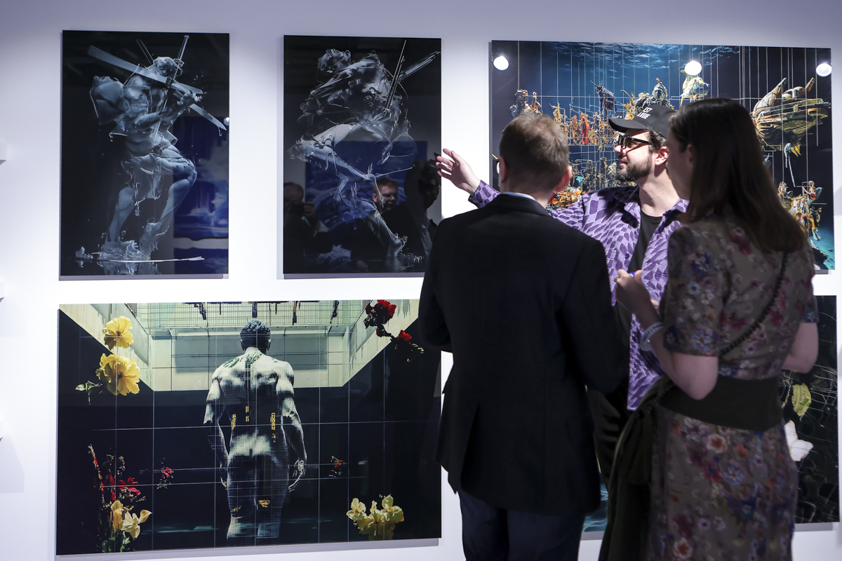 Еще один сосед «БИЗОN’а» — московская VS Gallery. Она показывает групповой проект четырех своих резидентов, которые используют для создания работ новые технологии. Исполнительный директор Александр Карлявин пояснил, что вся концепция стенда заключается в том, что это первая фиджитал галерея в России. «В рамках |catalog| мы в некотором смысле „единорог“. Мы не такие, как все остальные участник», — сказал он.