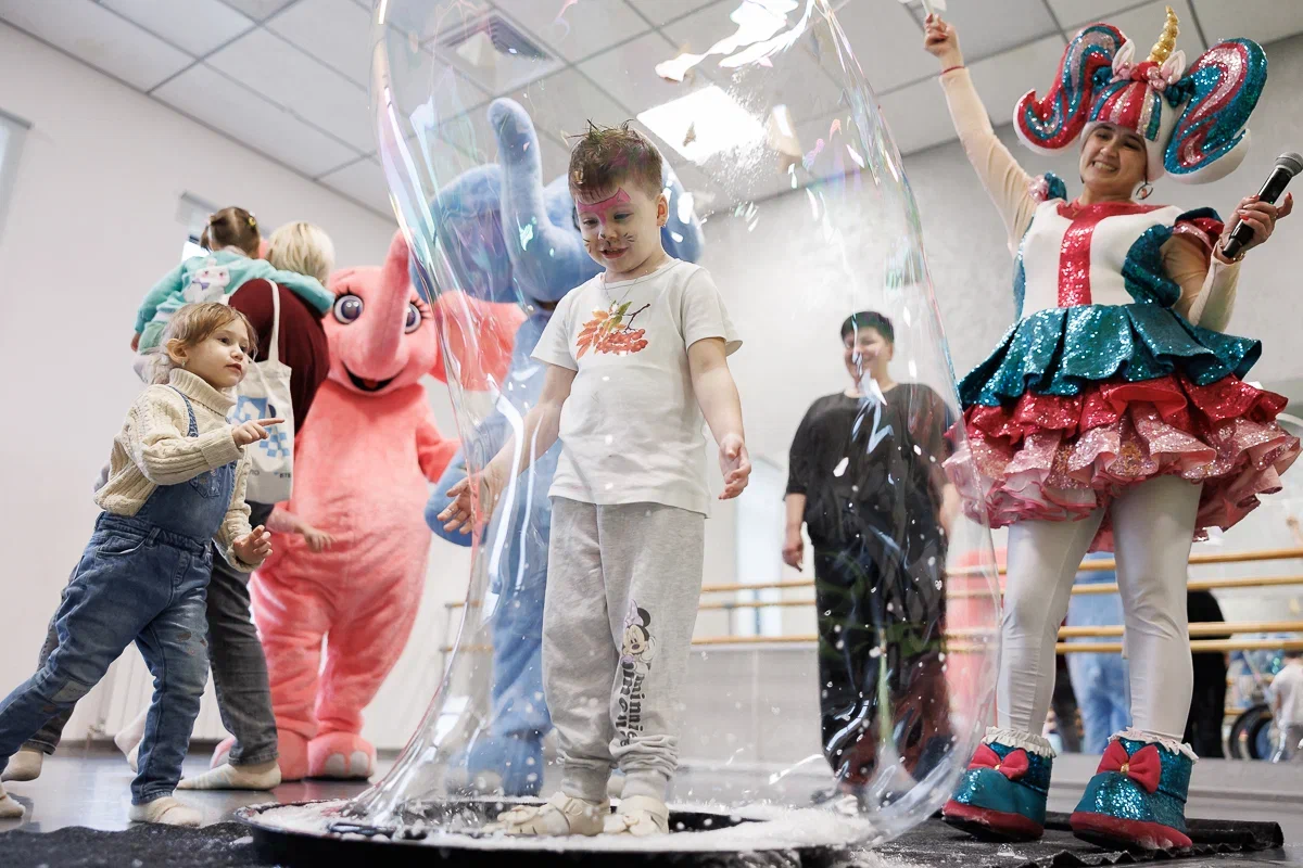 …А дети в это время вовсю развлекались с аниматорами. Маленькие гости водили хороводы, надували шары и были в полном восторге от огромного мыльного пузыря: кто-то пробовал танцевать внутри него, кто-то осторожно дотрагивался рукой, стараясь не лопнуть прозрачный шар.