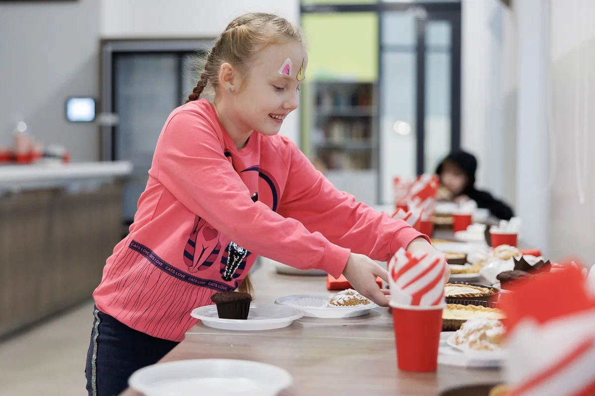 Пока мамы еще наслаждались процедурами и светской беседой, дети побежали к столу с угощениями. Здесь было много вкусного: блинчики со сметаной, пироги с фруктовыми начинками, татарский многослойный пирог с лимоном и черносливом, шоколадные маффины, профитроли с сахарной пудрой и горячий чай. Вся выпечка была приготовлена командой проекта «Преображение», чтобы маленькие гости после активных игр могли подкрепиться.