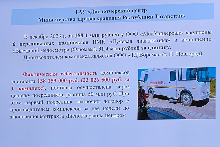 Например, по договору с ООО «Мед универсал» диспетчерский центр заказал у них 6 передвижных комплексов для выездного медосмотра (флюорограф, маммограф). Контракт вышел на 188 млн, цена одного такого комплекса — около 31 миллиона. Когда комиссия проверила закупку, выяснилось, что поставщик покупал эти комплексы не напрямую у производителя (нижегородский ТД «Ворсма»), а через ряд посредников. А вот производитель продавал эти комплексы дешевле — по 23 млн за штуку: по такой цене, например, у них закупал минпромторг РФ. Т. е. татарстанский диспетчерский центр в итоге переплатил за эти комплексы 50 млн рублей. «Удивительный момент — первый посредник заключил договор с производителем этих комплексов за две недели до заключения диспетчерским центром контракта на приобретение этих автобусов», — подчеркнул Гаязов.