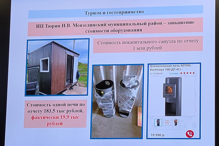 Еще один пример — из Мензелинского района. Там ИП Тюрин задумал «проект» за 5 млн рублей, который частично профинансировал бюджет, выдав ему субсидию в 3 млн рублей. Оказалось, что он кратно завысил стоимость купленного оборудования. Например, печи для палаток по документам и отчетам, которые он сдал проверяющим, стоили 183 тыс. рублей, а в открытых источниках члены комиссии нашли такие же печи за 20 тыс. рублей. Также ипэшник купил вагончик-туалет, по отчету — за 1 млн рублей. «На вагончике наверху указан номер телефона производителя. Мы просто позвонили, он говорит: вагончик стоит 160 тысяч рублей», — рассказал Гаязов. Ограждение из профнастила по отчетам стоило 5 тыс. рублей за квадратный метр, хотя его красная цена — до 1 тыс. рублей за «квадрат».
