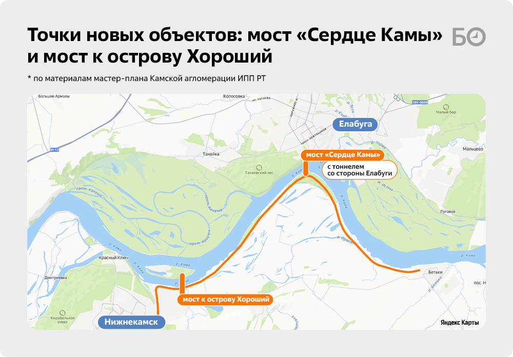 Чтобы решить пул возникших вопросов, планируется не только строительство моста «Сердце Камы», но и давно назревшая реконструкция моста через Каму в Набережных Челнах (ГЭС), плюс строительство обхода спутника агломерации — Заинска.