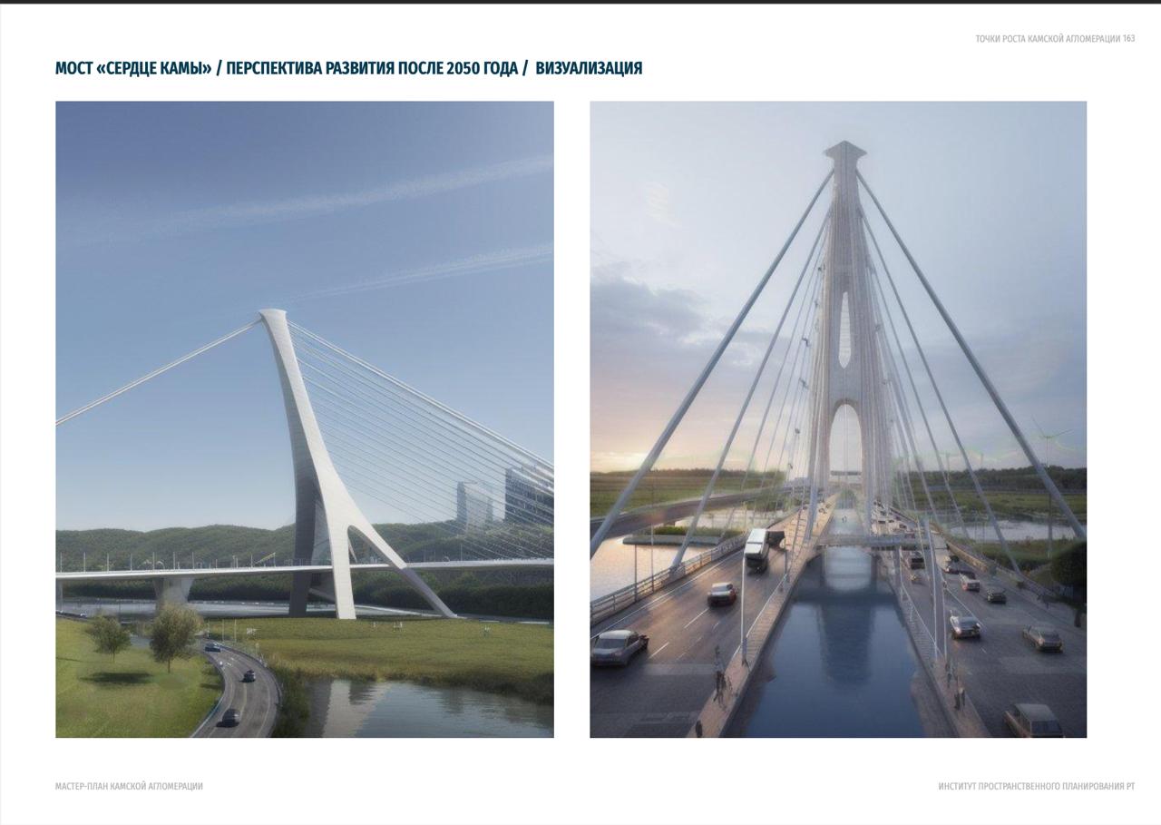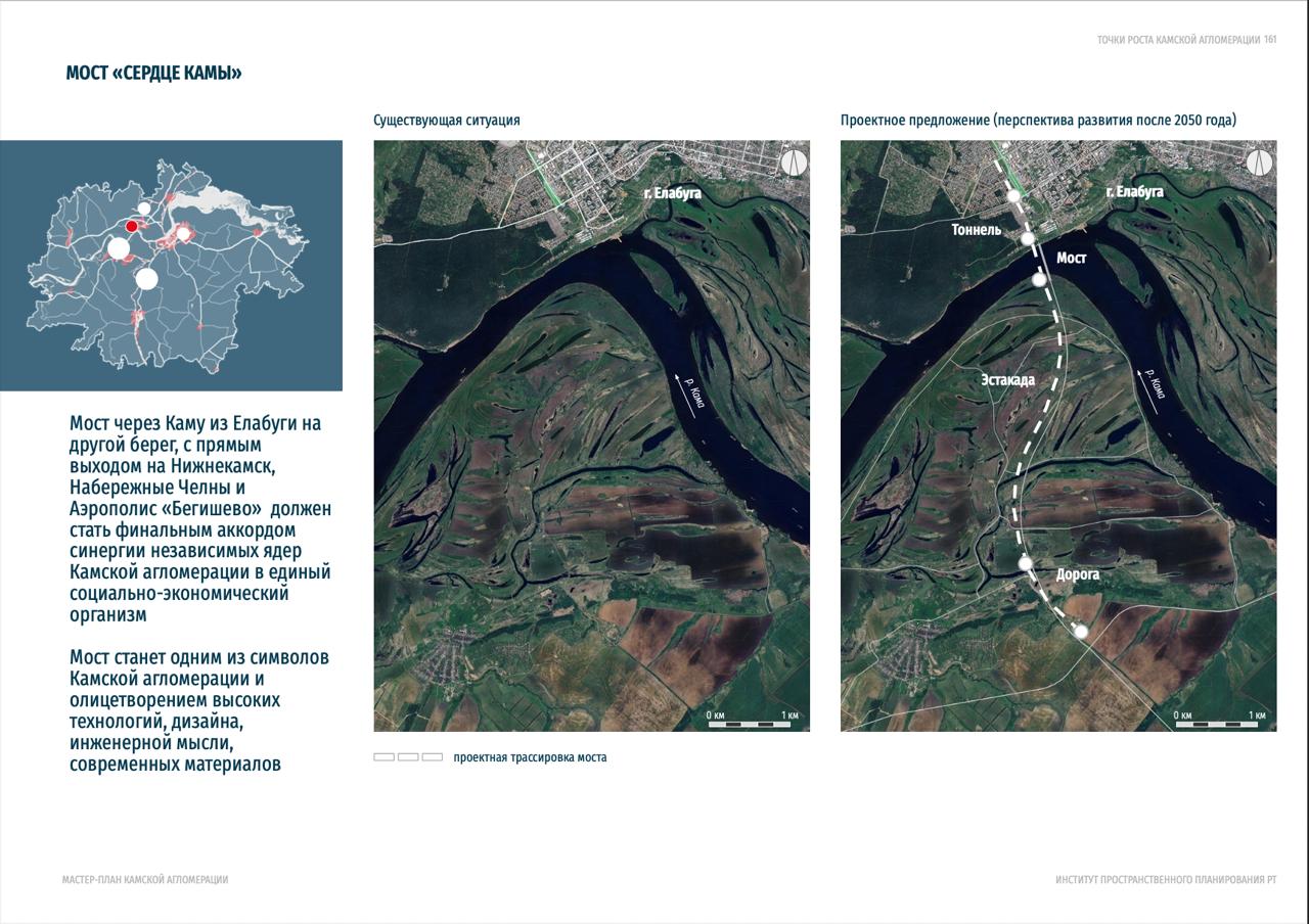 Для обеспечения связности территории по автомобильным дорогам институт предлагает грандиозный по масштабам проект моста через Каму из Елабуги на другой берег с прямым выходом на Нижнекамск, Набережные Челны и аэрополис Бегишево. При этом мост, по задумке создателей, станет «финальным аккордом синергии независимых ядер Камской агломерации в единый социально-экономический организм» и «одним из символов и олицетворением высоких технологий, дизайна, инженерной мысли, современных материалов».