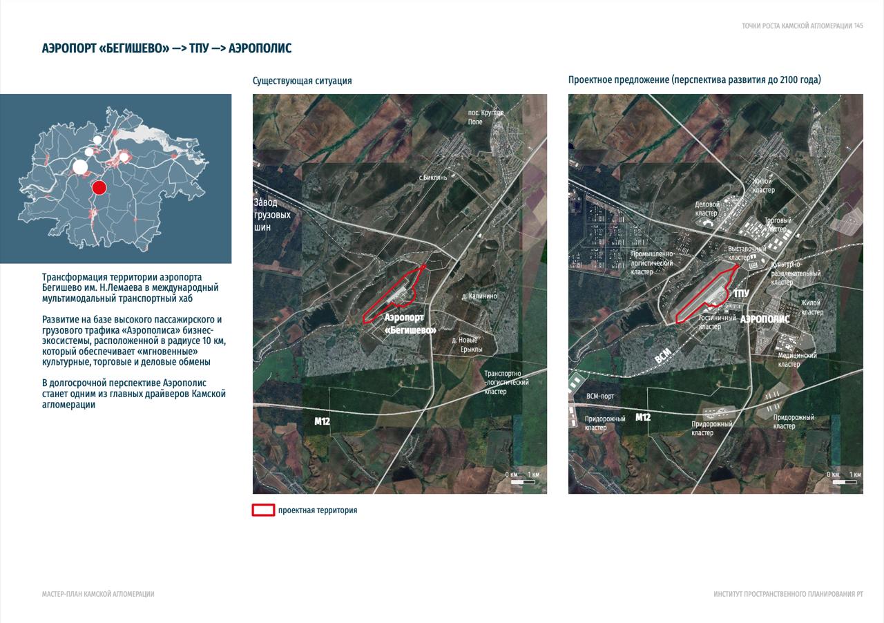 Если верить мастер-плану, произойдет трансформация территории аэропорта Бегишево им. Лемаева в международный мультимодальный транспортный хаб. В 10 км от аэрополиса будут расположены бизнес-экосистемы, которые обеспечат мгновенные культурные, торговые и деловые обмены. 45 тыс. жителей притянет территория с графиком 50 млн посещений в год, считают разработчики мастер-плана, будет создано 30 тыс. рабочих мест. Общая площадь территории кластеров — 1,9 тыс. гектаров.