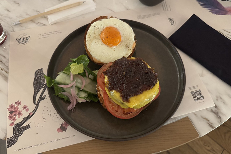 Фирменный домашний бургер. Это гастрономический конструктор с вербальной инструкцией по применению. Его приносят в трех частях на одной тарелке. На нижнюю половину, где уже на булку собрана сочная толстая котлета из мраморной говядины, расплавленный чеддер и слой лукового мармелада, надо нахлобучить верхнюю часть — булку с глазуньей, чтобы яйцо буквально растеклось по всему бургеру. Булку затем снять, добавить внутрь листья салата с огурцом и маринованным луком, который кучкой ждет своей очереди. Булку вернуть на место. Вот теперь можно есть. Это непросто, все течет, но действительно вкусно — официант не соврал. Перчатки в помощь.