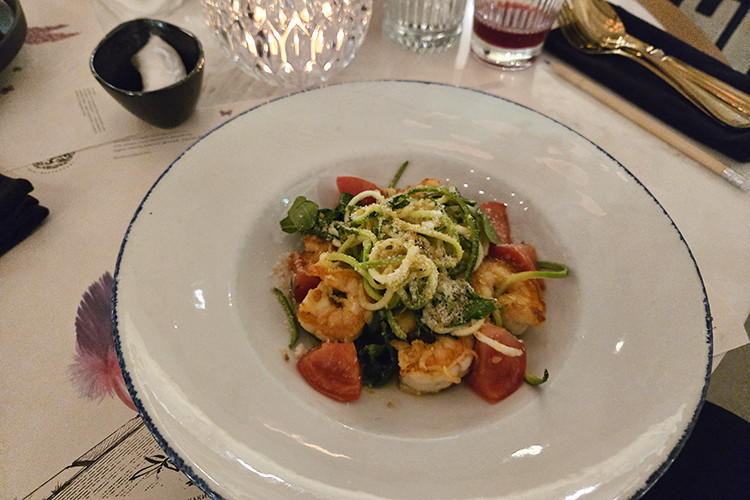 Паста из кабачка с тигровыми креветками. Модный, легкий вариант, если хочется пасты, а диета не позволяет. Лапша из зеленого цуккини альденте, социально приемлемое количество креветок среднего калибра, все посыпано лимонной цедрой, кедровыми орешками и сыром грано-подано в гомеопатических количествах. За помидоры — респект.