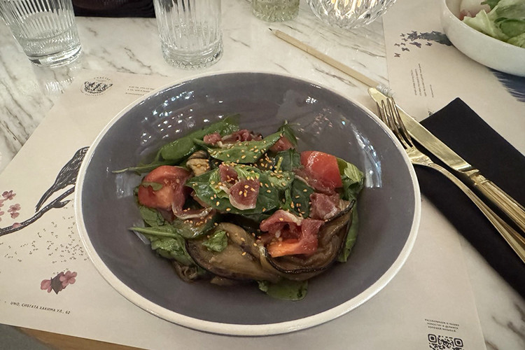 Салат с домашней шаркутерией. За красивым французским словом прячется кулинарное направление — приготовление холодных вяленых, консервированных и копченых деликатесов из мяса. В данном случае это утка или говядина пастрами на выбор. Выбор пал на утку — и в целом все, кроме нее, было прекрасно. Два вкусных листика рукколы, много почему-то горького шпината, отличные мисо-баклажаны с насыщенным сладко-соленым вкусом и плотной, карамелизированной текстурой, шикарный томат. Огурец, правда подкачал: его так качественно вымочили в соевом соусе, что складывалось впечатление, что ты пьешь его в чистом виде. Но сильнее всего расстроила солоновато-сыроватая утка — доедать не хотелось.