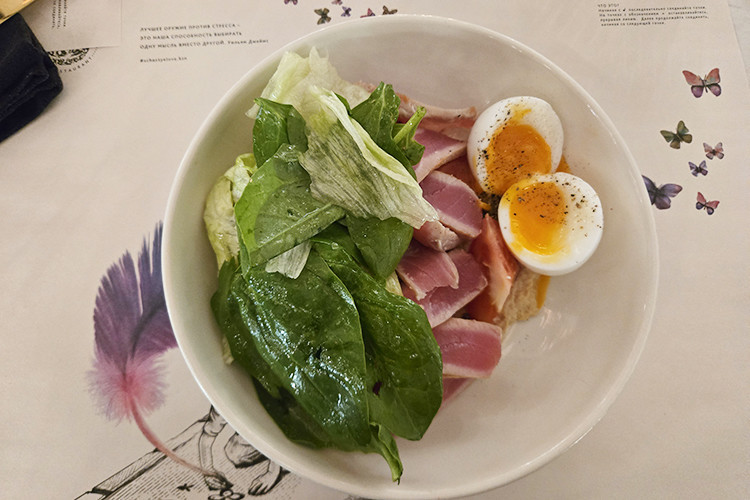 Салат с тунцом medium rare — хорошая, добротная вариация на тему нисуаза, только лежащая в соусе тоннато из консервированного тунца, которым обычно поливают телятину, и получается «Виттело тоннато». Тут же тунец в тунце, ну и ладно. Прожарка medium rare получилось как надо, рыба тоже солоновата, но это компенсируется яйцом и картофелем.