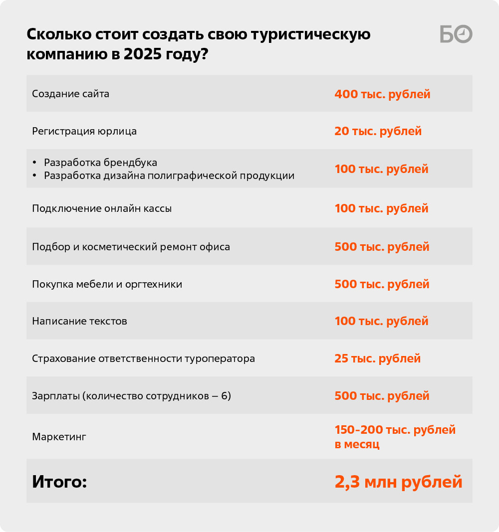 Если открывать туркомпанию сейчас, потребуется минимум миллион. На первый взгляд кажется, что этот бизнес не требует больших вложений, но как бы не так. Создание и SEO-продвижение сайта обойдутся в несколько сотен тысяч рублей, сбор информации, написание текстов, поиск фотографий — все это очень трудоемко. Если пытаться все делать самостоятельно, можно очень быстро выгореть. Разработка туристических буклетов, оплата связи, домена, страхование… Все это неявные на первый взгляд затраты, которые накапливаются в большую сумму.