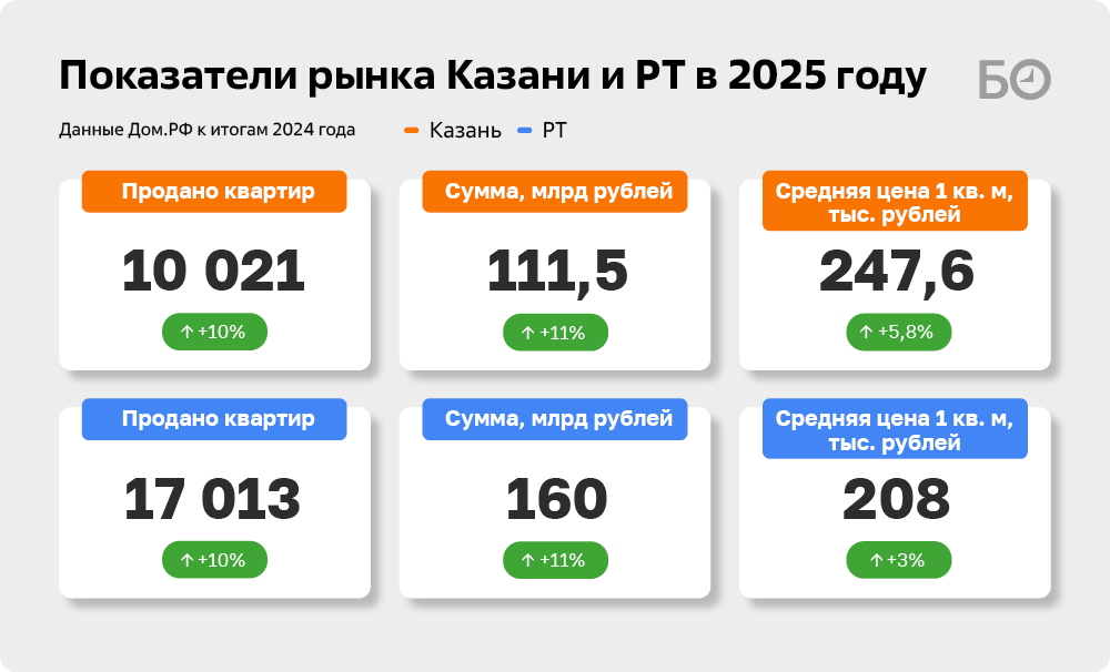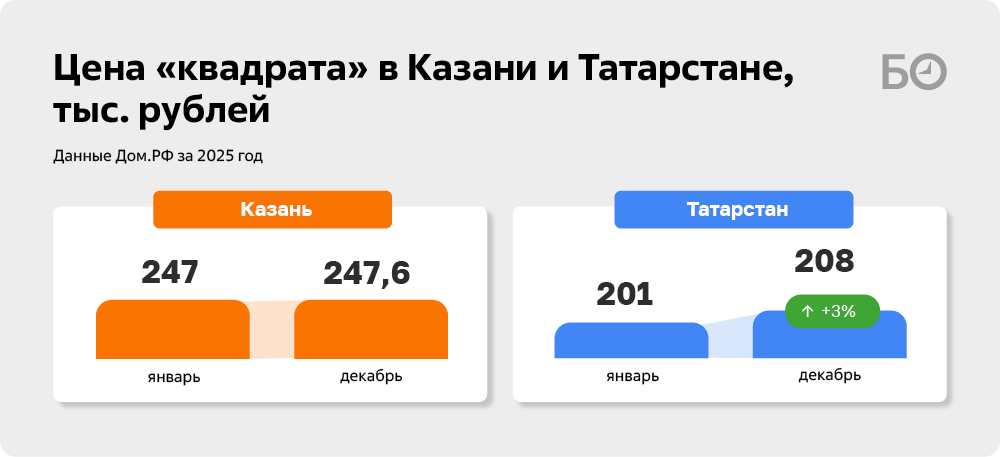 Средняя цена квадратного метра в проданных новостройках РТ (включая и столицу) с января по декабрь 2025 года выросла на 3% до 208 тыс. рублей, сообщает Дом.РФ. По Казани «квадрат» в среднем на протяжении года продавали за 247 тыс. рублей, рост был только в январе. Для сравнения, цена квадратного метра за 2024 год в столице РТ выросла на 13% до 234 тыс. рублей, а по Татарстану на 19% до 202 тыс. рублей.