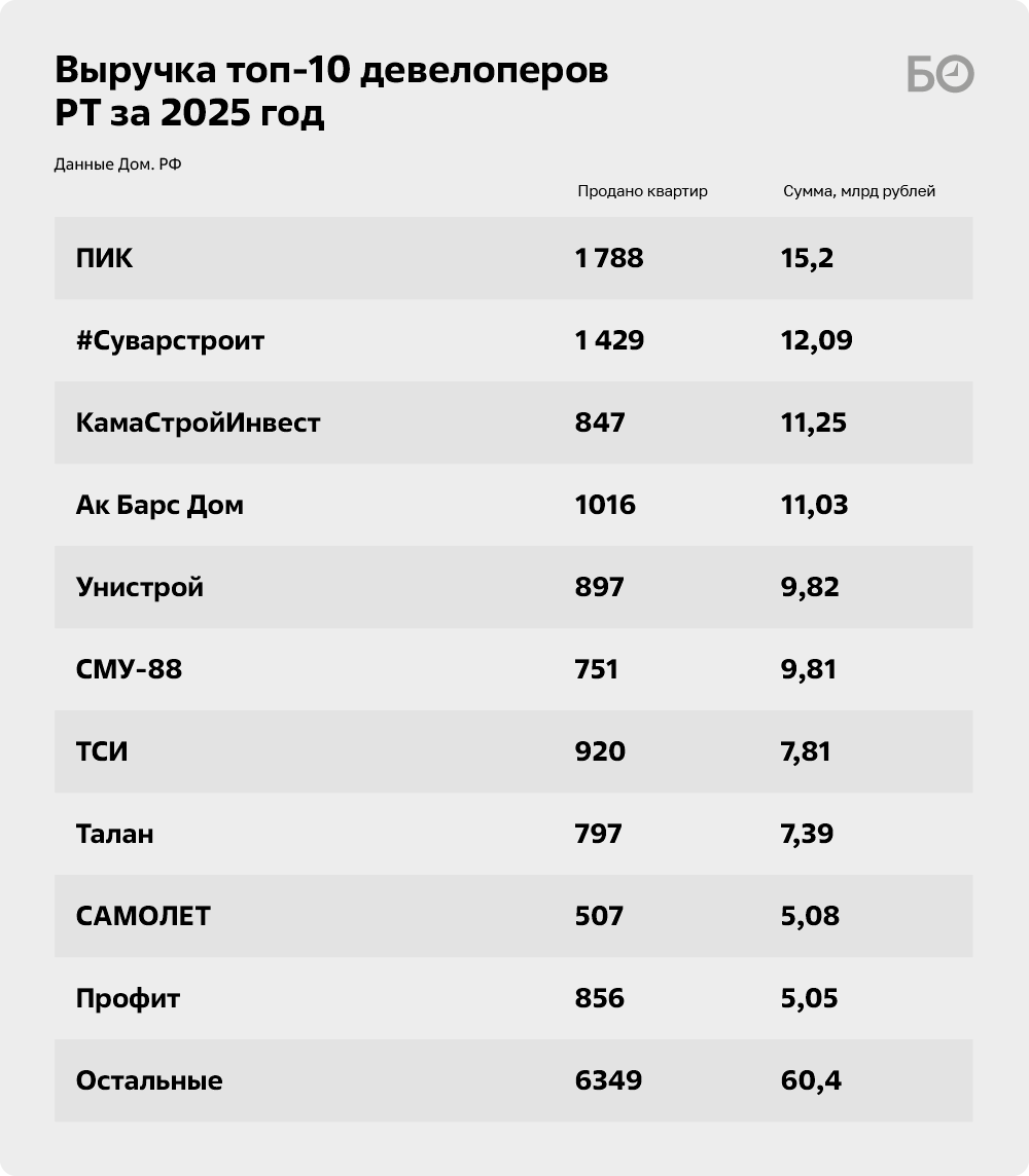 Новички на девятой и десятой строчках рейтинга. «Самолет» реализовал в Казани 507 жилых объектов за 5,08 млрд рублей, а замыкает десятку представитель Набережных Челнов — «Профит» — продано 856 квартир за 5,05 млрд рублей. Две замыкающие компании вытеснили из годового топ-10 питерский «Эталон» — за 2025 год компания продала в казанских проектах 116 квартир на 1,87 млрд рублей, а также «Новастрой» — 305 жилых помещений за 2,3 млрд рублей по итогам прошлого года.