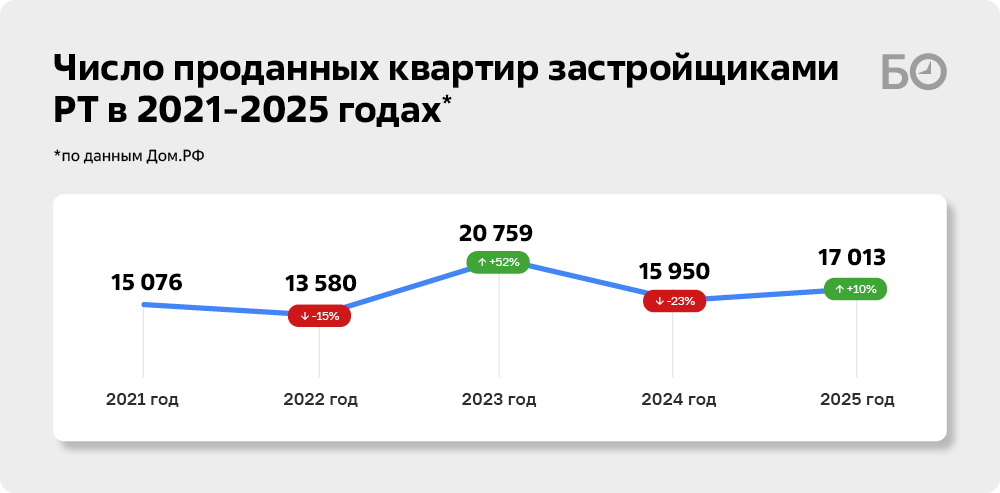 Тренд Татарстана созвучен общероссийскому. За год девелоперы РФ поставили абсолютный рекорд выручки — 5,57 трлн рублей, что на 12% выше 2024-го. И это самая крупная сумма за историю рынка. К прошлому году число проданных квартир в России выросло на 2,4% до 584,1 тыс., из которых 84 тыс. пришлись на декабрь.