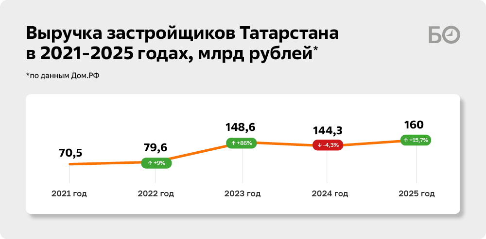 По итогам 2025 года застройщики Татарстана продали квартир на 160 млрд рублей, что на 11% больше аналогичного показателя 2024-го. Такова статистика «Дом.РФ». По Казани финансовый результат застройщиков за год также увеличился на 11% до 111,5 млрд рублей. Выросло и количество проданных квартир по региону — на 10% до 17 тысяч.
