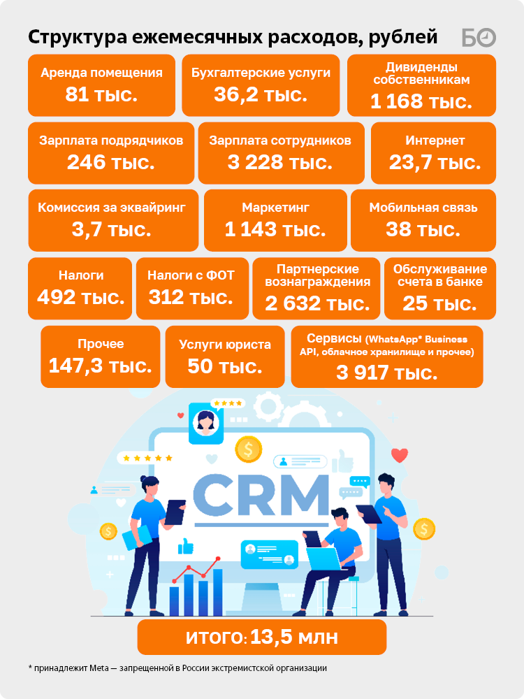 Сейчас мой личный доход составляет около 1,5 млн в месяц. Выручка компании — 12–15 млн рублей в месяц. Все долги мы закрыли только в прошлом году. У нас выросла команда в Казани, мы работаем с 34 странами — Казахстан, СНГ, Штаты, Европа, Арабские Эмираты. 70% наших клиентов — Россия, но остальные 30% — иностранцы, и они продолжат пользоваться WhatsApp*, даже если его заблокируют в РФ.