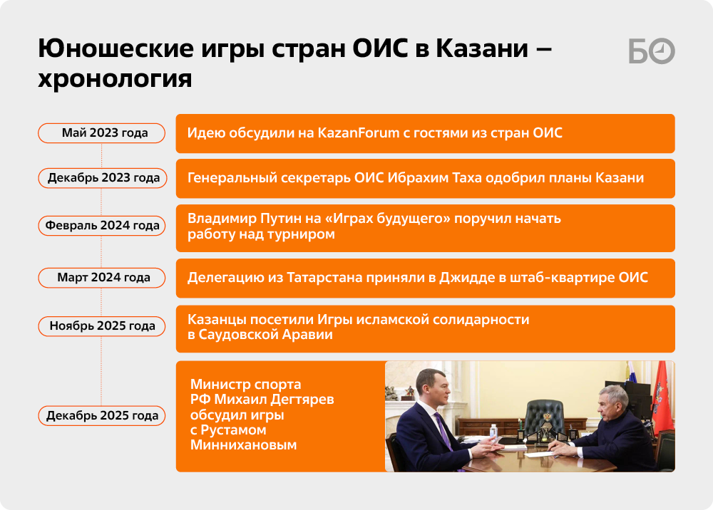 Как в конце декабря объявил на итоговой пресс-конференции министр спорта республики Владимир Леонов, обсуждалось три мероприятия. Два он не назвал, а вот одно из них — юношеские Игры стран ОИС. Ранее о планах на турнир неоднократно говорил сам Минниханов, а исламская организация поддерживала намерения Казани в виде различных обращений и писем секретариата.