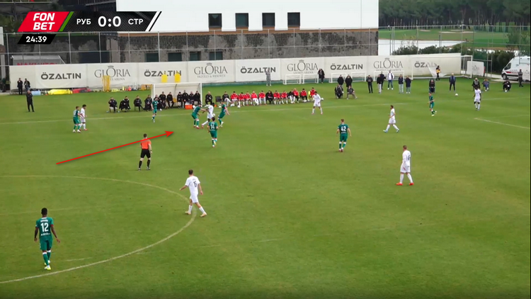 Любопытных деталей много. Казанцы стараются выполнять установку тренера на владение мячом, но пока оно больше выглядит как его перекаты на чужой половине поля. Линия защиты высоко прессинговала. На скриншоте ниже стрелкой показано, как Игор Вуячич подключился для отбора из своей позиции центрального защитника. Отметим, что в момент прессинга на чужой половине было 9 игроков (защитник Тесленко остался в центральном круге, один футболист не попал в кадр трансляции).