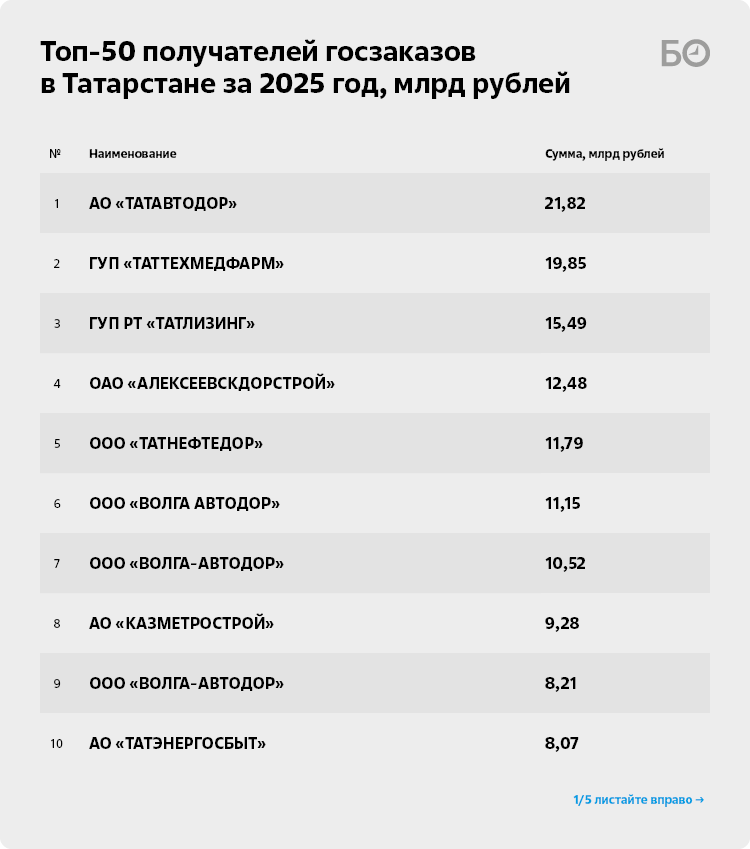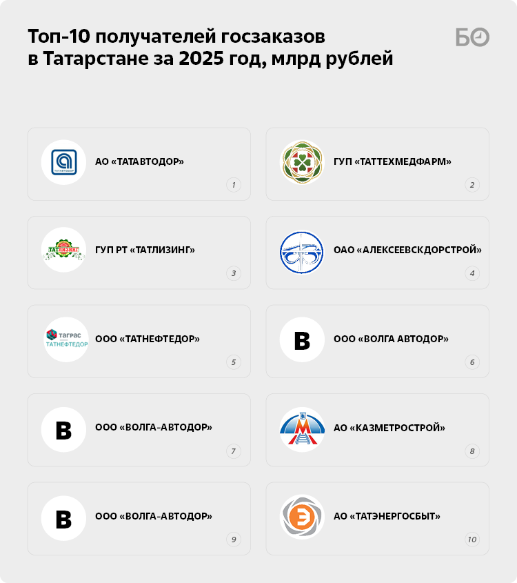 В РТ объем государственных закупок в 2025 году вырос на четверть, достигнув 606 млрд рублей. При этом система распределения контрактов вызывает вопросы — от минимальной конкуренции и мизерной экономии до подозрительно коротких сроков исполнения и жалоб на аффилированность сторон. В топ-50 подрядчиков традиционно вошли хозяева татарстанских дорог в лице «Татавтодора» и «Алексеевскдорстроя», распорядитель строительных подрядов ГУП «Татлизинг», а также король фармы — компания «Таттехмедфарм». О том, почему тендеры часто превращаются в формальность и как это сказывается на эффективности расходования денег, — в материале «БИЗНЕС Online».