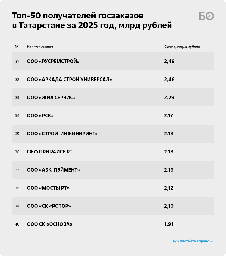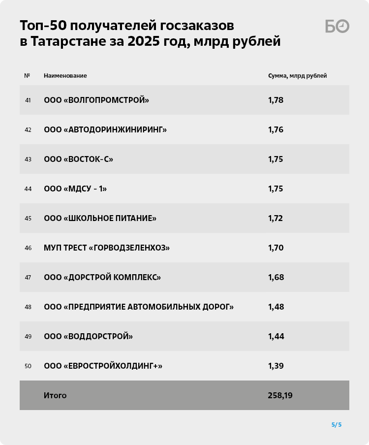 На 4-м месте среди крупнейших «потребителей» бюджетных денег — известная в республике компания, занимающаяся строительством дорог, — ОАО «Алексеевскдорстрой» (4) депутата Госсовета РТ Фоата Валиева и Алексея Демидова (двоюродного брата главы Алексеевского района республики). Стоимость заключенных господрядов составила 12,5 млрд рублей при подписанных 59 контрактах. Причем это только договоры, подписанные с татарстанскими заказчиками, предусматривающие работы в РТ. Еще четыре контракта на 1 млрд будут исполнены в соседнем Башкортостане. К сведению, за 2024 год компания выиграла в тендерах почти 3,8 млрд рублей, что тогда соответствовало 13-му месту в рейтинге топ-50 получателей госзаказов.