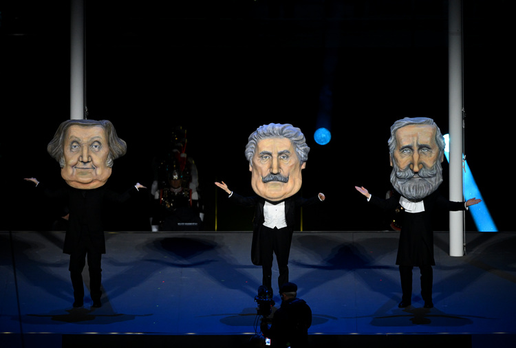 Нет, это не попытка итальянцев изобразить кого-то из высоких гостей церемонии. Это итальянские композиторы Джузеппе Верди, Джакомо Пуччини и Джоаккино Россини. Им уделили отдельный номер, а потом они просто танцевали в разных частях церемонии под современную танцевальную музыку. Этими большими головами итальянцы явно нацелились на TikTok. (Фото: Peter Kneffel, dpa, globallookpress.com)