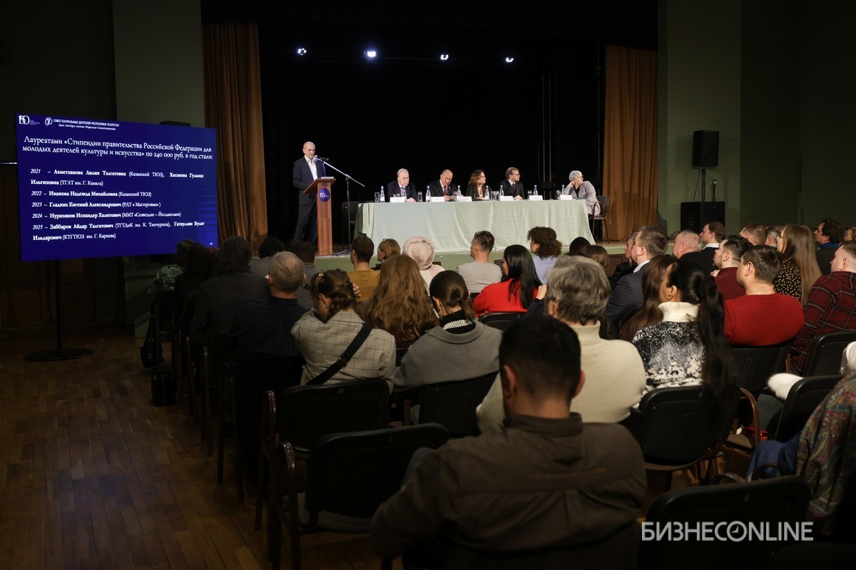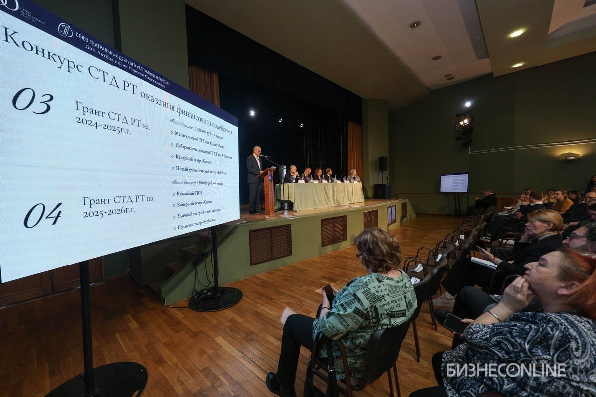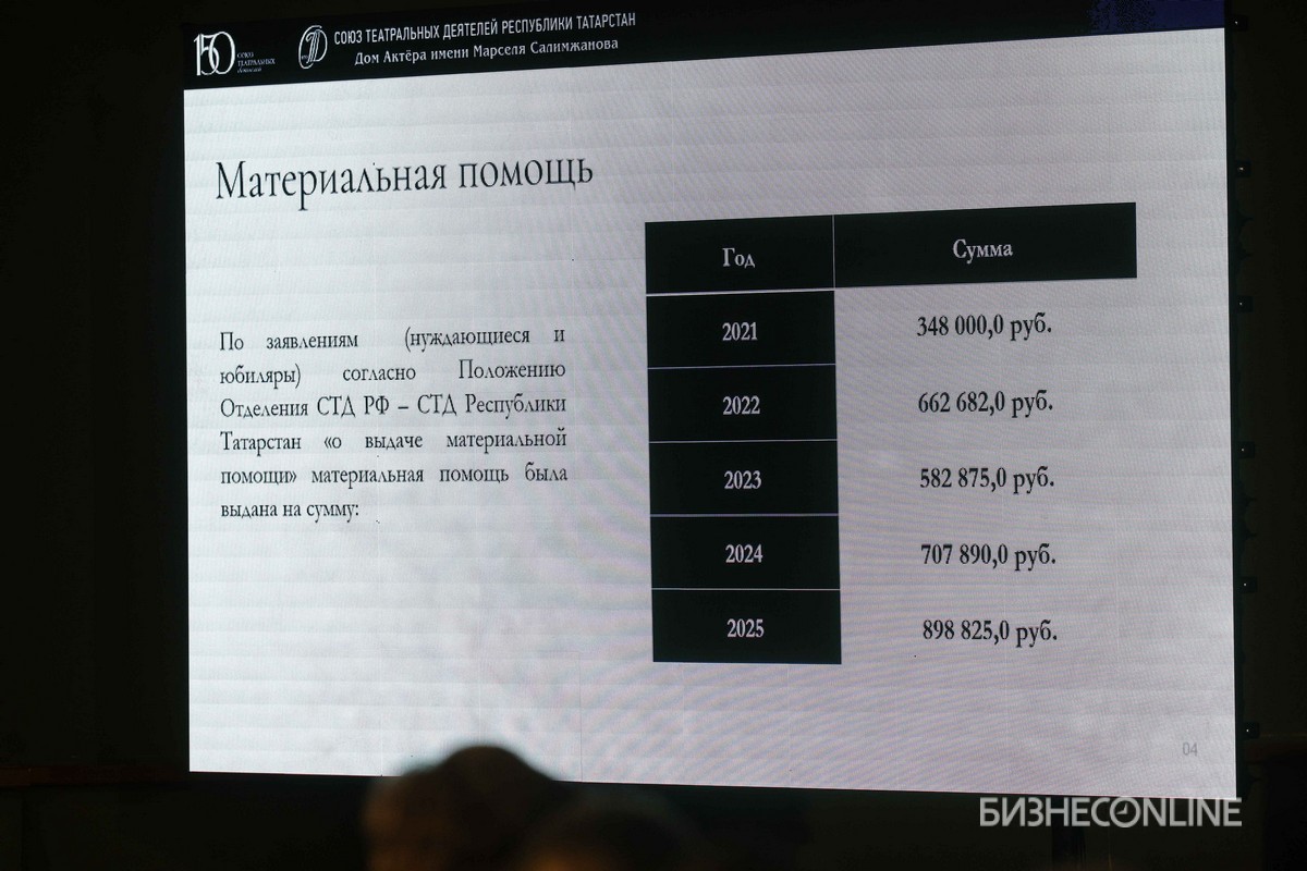 Началось мероприятие с того, что главреж театра им. Камала подвел итоги пятилетки союза. С 2021 по 2026 год численность членов увеличилась с 565 до 743, в то же время за пять лет из жизни ушли 35 человек. «Ежегодно неработающие пенсионеры получают по 1 тысяче рублей в квартал. В юбилейный год Победы ветеранам-участникам были выплачены по 20 тысяч из бюджета СТД РТ», — отчитался Бикчантаев. Оказывается помощь и молодежи:, так, стипендия СТД РФ, присуждаемая членам союза до 35 лет на создание проектов в области культуры и искусства, составляет 72 тыс. рублей.
