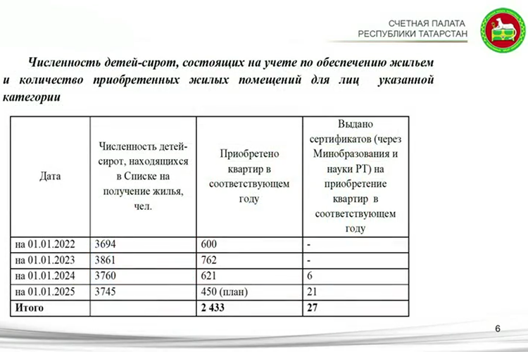 «Все упирается в финансирование. В прошлом году только 450 человек получили квартиры. А в списке — 3,7 тысячи человек!» — обозначил чиновник. Судя по презентации Счетной палаты, в 2025-м на приобретение квартир сиротам было выделено 1,730 млрд рублей из бюджета РТ, тогда как в 2024-м — 1,842 млрд рублей.