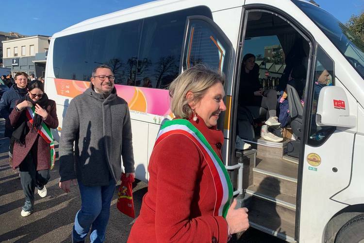 Дама в красном пальто — мэр Чернуско. Она вышла на эстафету в туфлях, пальто и брюках — уж совсем не позавидуешь.