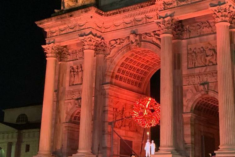 Процесс транслировали на «Сан-Сиро». Огонь зажигали итальянские горнолыжники Альберто Томба и Дебора Компаньони.
