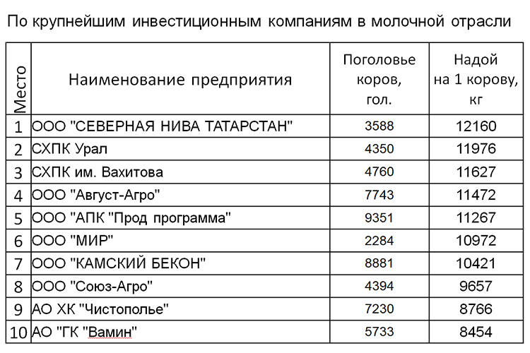 Среди крупнейших инвестиционных компаний Татарстана ситуация выглядит следующим образом: лучший показатель у ООО «Северная Нива Татарстан» Штефара Дюрра, где каждая из 3,6 тыс. коров дает в среднем 12,2 тыс. кг молока в год. На 2-м и 3-м местах оказались кукморские молочники: СХПК «Урал» (почти 12 тыс. кг на голову) и СХПК им. Вахитова (11,6 тыс. га).