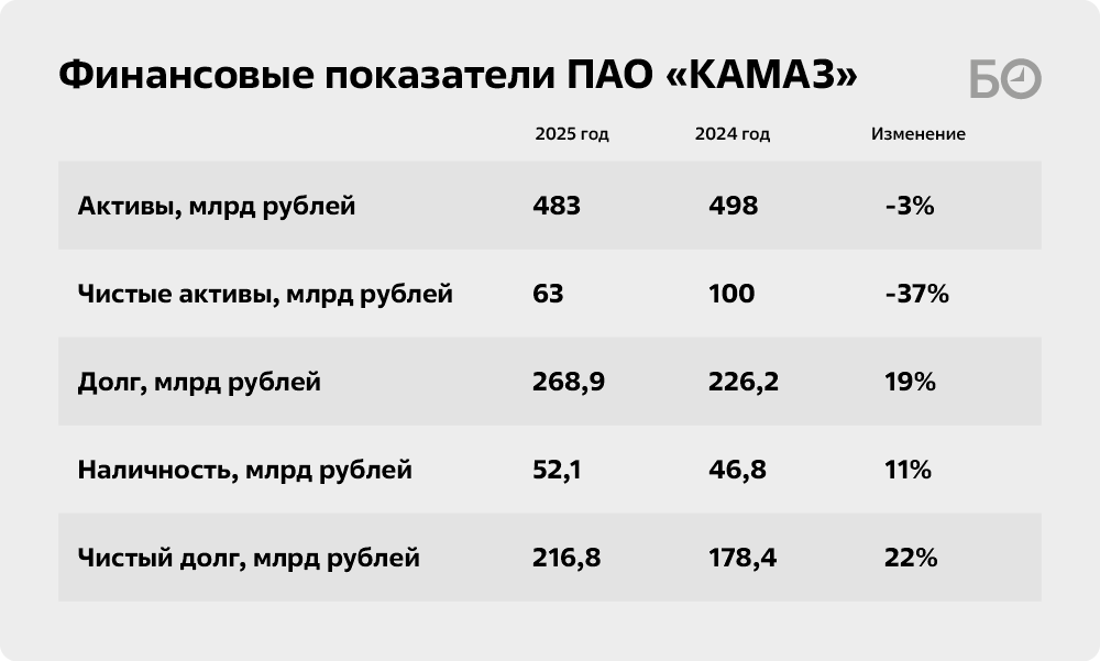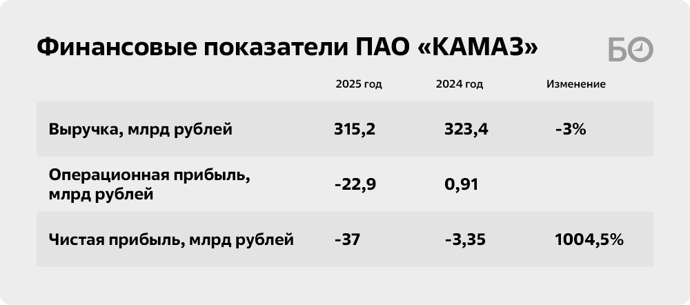 Чистый убыток ПАО «КАМАЗ» за 2025 год превысил 37 млрд рублей — это в 11 раз больше показателей 2024-го, когда предприятие показало убыток «всего» в 3,8 млрд рублей