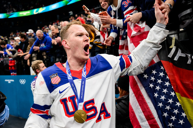 Отойдем ненадолго от церемонии и вспомним главные события Олимпиады. Несомненно, главное из них случилось в последний день Игр — сборная США сенсационно обыграла Канаду (2:1 ОТ), которая привезла всех своих звезд из НХЛ. Обе команды забивали по 5–6 шайб на групповом этапе, но в этот же раз забили три шайбы на двоих. Последняя, как это должно быть в таких матчах, случилась в овертайме. Для США это первая победа на Олимпиаде в хоккее с 1980 года. (Фото: Joel Marklund, globallookpress.com)