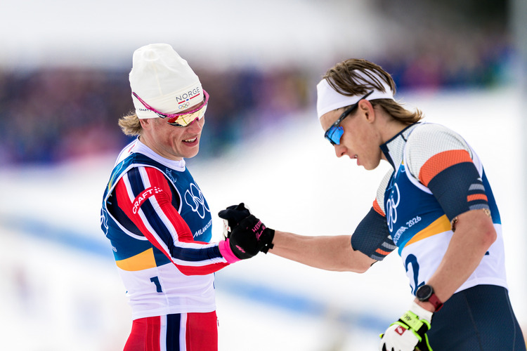 Савелий Коростелев выступал чуть увереннее: в скиатлоне он стал четвертым, а в марафоне — пятым. Но до медалей всегда чего-то не хватало. В субботу на последней гонке Коростелев отдал почести великому Клэбо. «Надо потренироваться», — подписал эту фотографию Савелий у себя в соцсетях. Еще раз напомним: Йоханнес выиграл 6 золотых медалей за одну Олимпиаду! (Фото: Maxim Thore, Keystone Press Agency, globallookpress.com)