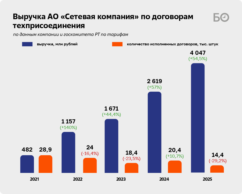 Пока бизнес размышляет, как двигаться дальше без доступного электричества, Сетевая фиксирует новые финансовые рекорды. В 2024-м выручка «держателя сетевого котла» в Татарстане за технологическое присоединение выросла за год аж на 57% до 2,6 млрд рублей. В деньгах превышение составило 1 млрд рублей. Объем услуг в этой части вырос не столь внушительно. Так, количество исполненных договоров подскочило на 10,7% (до 20,4 тыс.), мощность — на 1,2% (до 523 МВт). В 2025-м, судя по презентации госкомитета РТ по тарифам, сетевиков ждал очередной максимум. Выручка СК от техприса выросла еще на 53% до 4 млрд рублей, при этом количество исполненных договоров, наоборот, снизилось до 14,4 тысячи.
