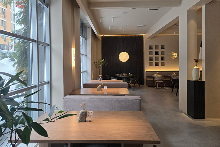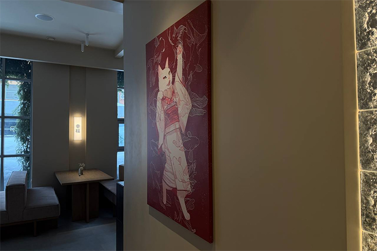 Интерьер Kuji — это спокойный, теплый и очень «дышащий» современный азиатский минимализм. Это светлое, уютное пространство с высокими потолками. Основные цвета мягкие, природные: теплый бежевый, светло-серый, коричневый. Но лаконичная база аккуратно дополнена примечательными деталями. Круглый светильник на фоне черной стены напоминает луну, в нишах живет мохнатый дух леса Тоторо, придуманный Хаяо Миядзаки, по стенам (и на дне соусничек) плывут карпы кои, машет лапкой кошка в кимоно с картин японской художницы Маи Оно, а встречает гостей иероглиф 幸福 (счастье).