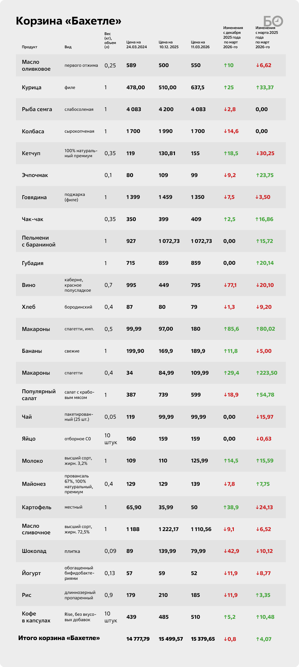 За год продуктовая корзина в «Бахетле» подорожала на 641 рубль — с 14,7 тыс. до 15,4 тыс. рублей. С конца прошлого года итоговый чек и вовсе снизился на незначительные 0,5%. Подешевели до прошлогодних значений форель (впрочем, на полках есть и семга за 640 рублей за 120 г) и брауншвейгская колбаса, стабильны цены на товары собственного производства сети — губадию и пельмени с бараниной. Приятный сюрприз для сладкоежек: плитка самого дешевого шоколада «Аленка» подешевела на 42% по сравнению с декабрем прошлого года и обойдется в 79 рублей (даже в «Магните» дороже!). «Золотые» плитки лакомства из ОАЭ за 4 тыс. рублей также присутствуют на полках.