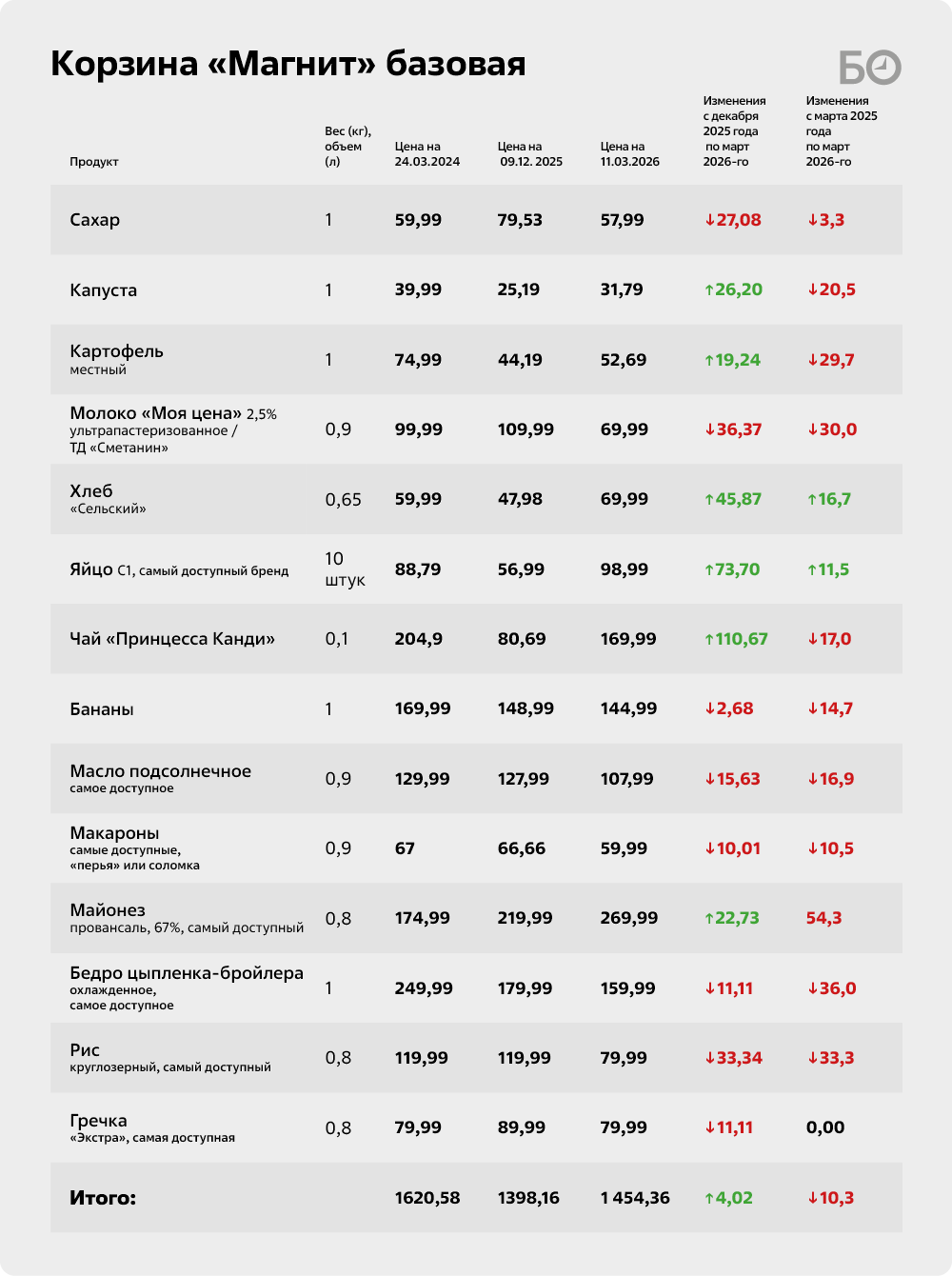 Цены в расширенной корзине федеральной сети даже приятно удивляют: за год она подешевела на 20%, а за квартал — на 16%. Базовая корзина «Магнита» за год «схуднула» всего на 10%, а в сравнении с декабрем 2025-го выросла в цене лишь на 4%. В основном продуктовый набор подешевел за счет снижения цен на кофе (баночка Jacobs Monarch продается с 52-процентной скидкой без учета карты лояльности) и социально значимые товары — хлеб, курицу и крупы.