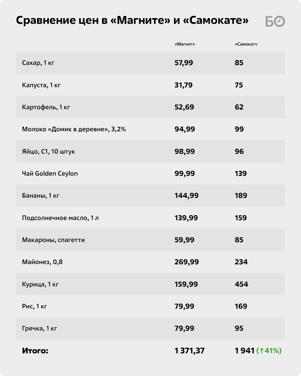 Разрыв между базовыми корзинами «Магнита» и «Самоката» увеличился почти на 200 рублей — с декабрьских 400 рублей до 569 сейчас. Практически все позиции выгоднее покупать в магазине по пути домой. Нет большой разницы при покупке молока 3,2-процентной жирности и яиц — и у «Самоката», и у «Магнита» они находятся в одинаковых ценовых пределах, в остальном за то, что привычный набор продуктов принесет к двери курьер, а самому не придется стоят в очередях, придется доплатить.