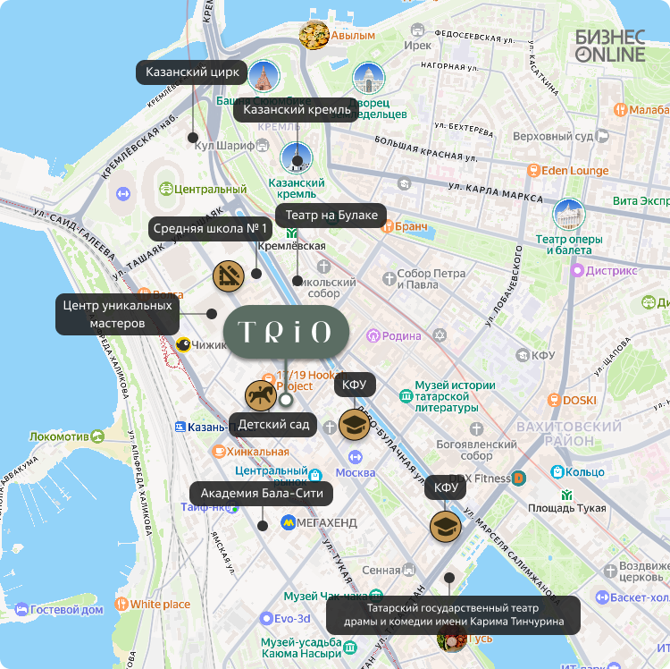 — Да, но улица наполняется жизнью. Вокруг нашего «Трио» повсеместно строятся или уже построились новостройки. В большинстве по первым этажам будут коммерческие помещения, что добавит месту новых ресторанов, магазинов, бутиков. Да и в целом локация заметно привлекает и девелоперов, и инвесторов, что немудрено. Впритык от «Трио» есть муниципальный детский сад. В двух минутах — детский сад «Бала-Сити» с углубленным изучением иностранных языков, ближе к Кремлю — средняя школа №1. Вокруг десятки филиалов казанских вузов. В шаговой доступности Кремлевская набережная, Казанский цирк, многочисленные скверы, парки, кафе.
