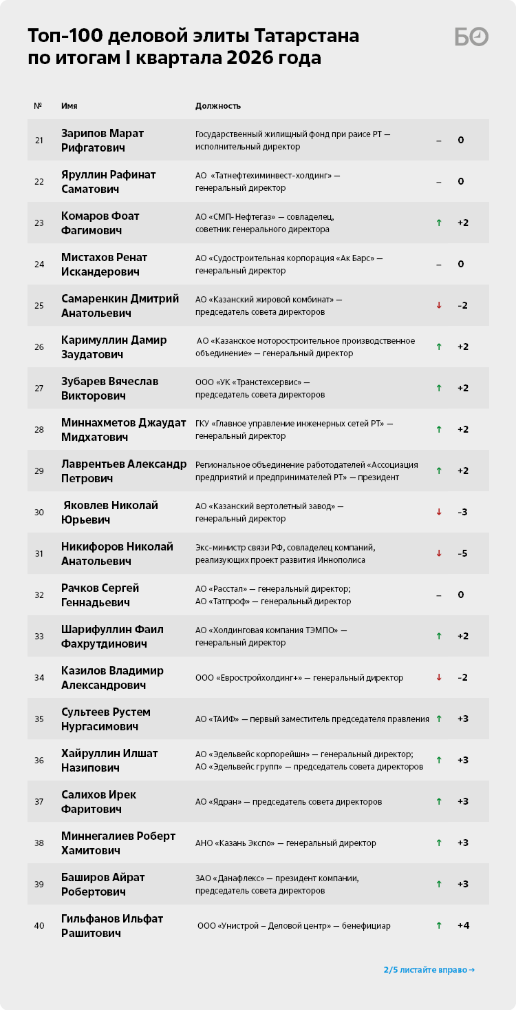 В целом благодаря ближневосточному кризису в рейтинге топ-100 деловой элиты РТ улучшают позиции и другие участники, связанные с нефтяным бизнесом. Речь о помощнике раиса Татарстана по вопросам нефтяной промышленности Шафагате Тахаутдинове (7-е место) и совладельце АО «СМП-Нефтегаз» Фоате Комарове (23-е место), а также семье Шаймиевых — гендиректоре ООО «Нира-Экспорт» Радике Шаймиеве (9-е место), гендиректоре АО «Татавтодор» Айрате Шаймиеве (10-е место) и гендиректоре ООО «МНТК» Тимуре Шаймиеве.