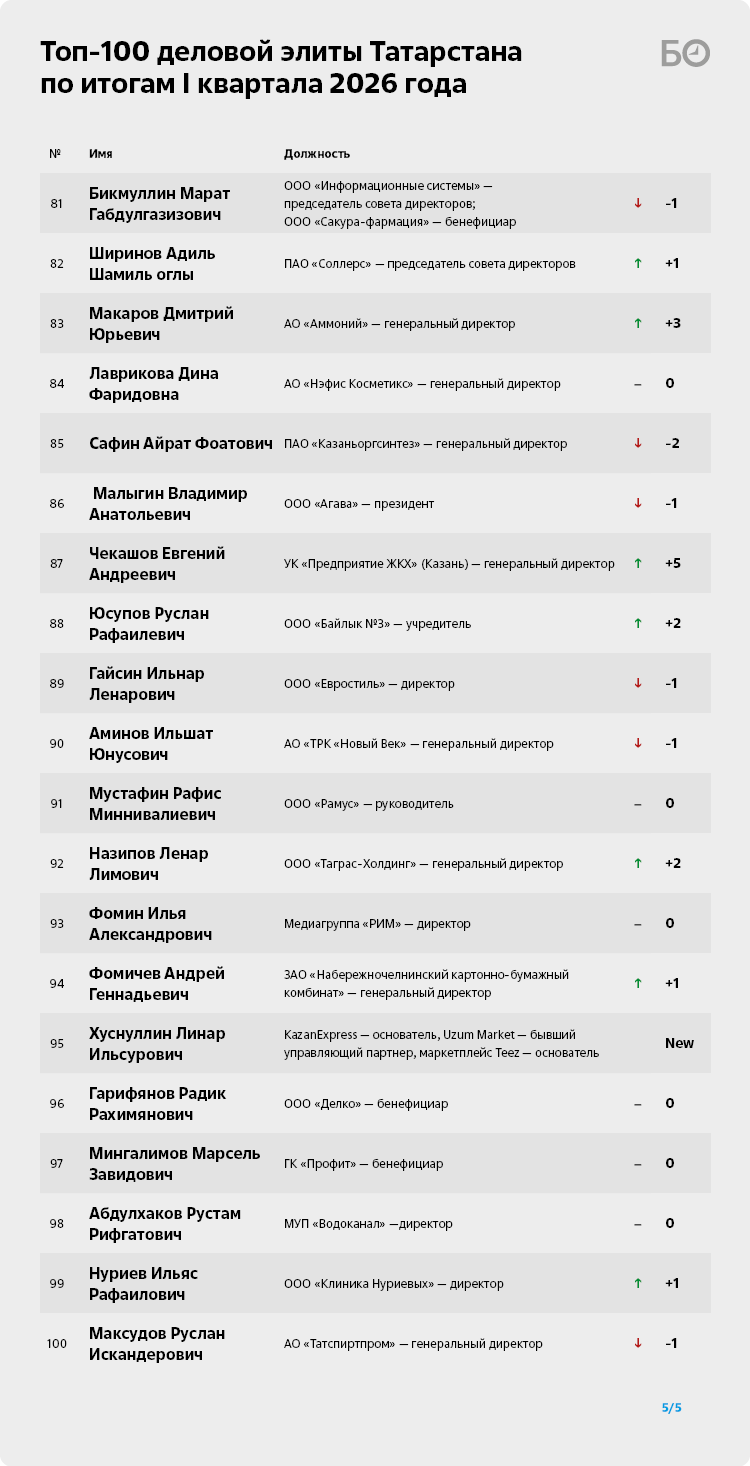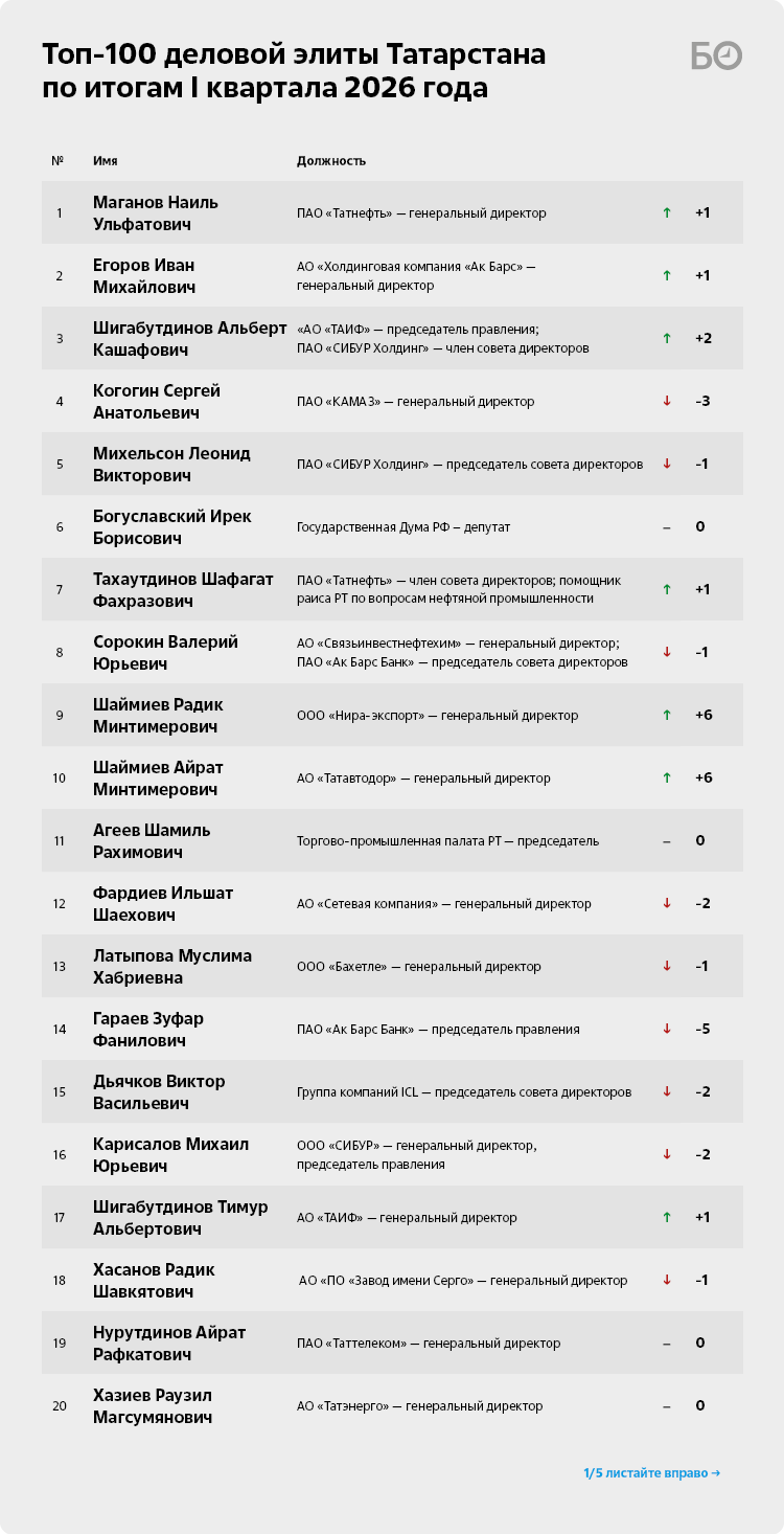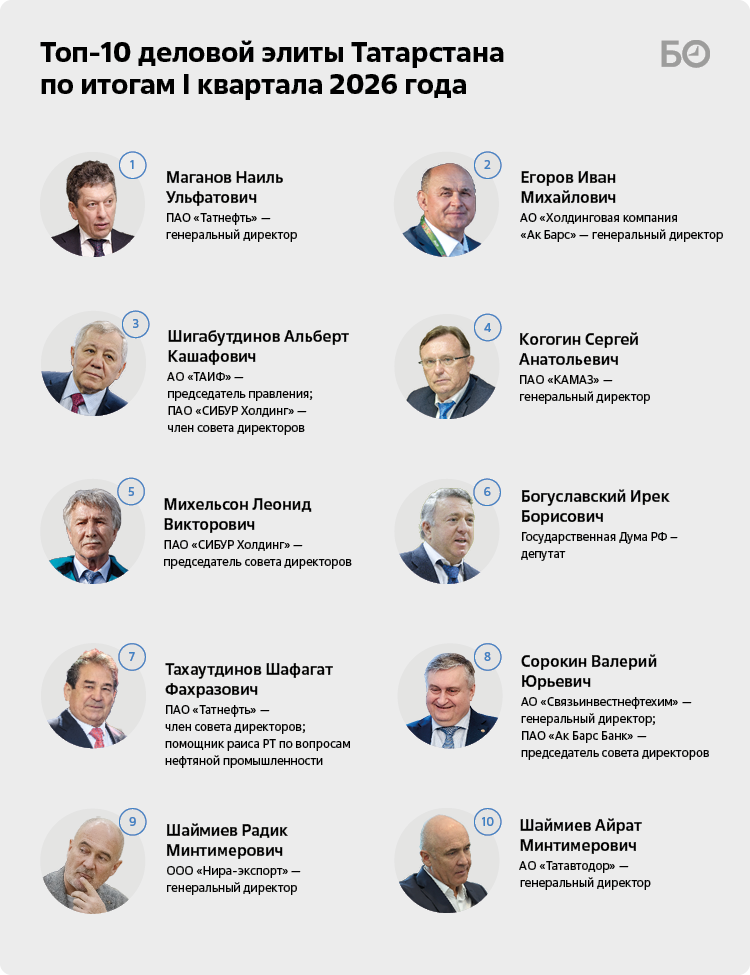 По итогам I квартала 2026 года гендиректор ПАО «Татнефть» Наиль Маганов возвращает себе лидерство в рейтинге топ-100 деловой элиты Татарстана. Из-за войны США и Израиля против Ирана цены на нефть пошли вверх. Например, стоимость нефти марки Brent буквально удвоилась за I квартал — в моменте превышала отметку в $118 за баррель. Ормузский кризис и сокращение поставок черного золота через пролив привели к уменьшению дисконта на российские сорта нефти на «десятки процентов», как заявил президент Петербургской биржи Павел Артемьев. К тому же, пусть пока и временно, США ослабили санкции на российское черное золото, разрешив до 11 апреля транзакции по разгрузке судов, загруженных до 12 марта. Указанные сроки имеют все шансы сдвинуться, а зная, как российские нефтяники научились творчески обходиться с документами и накладными, объемы нефти в танкерах могут оказаться гораздо большими, чем казалось.