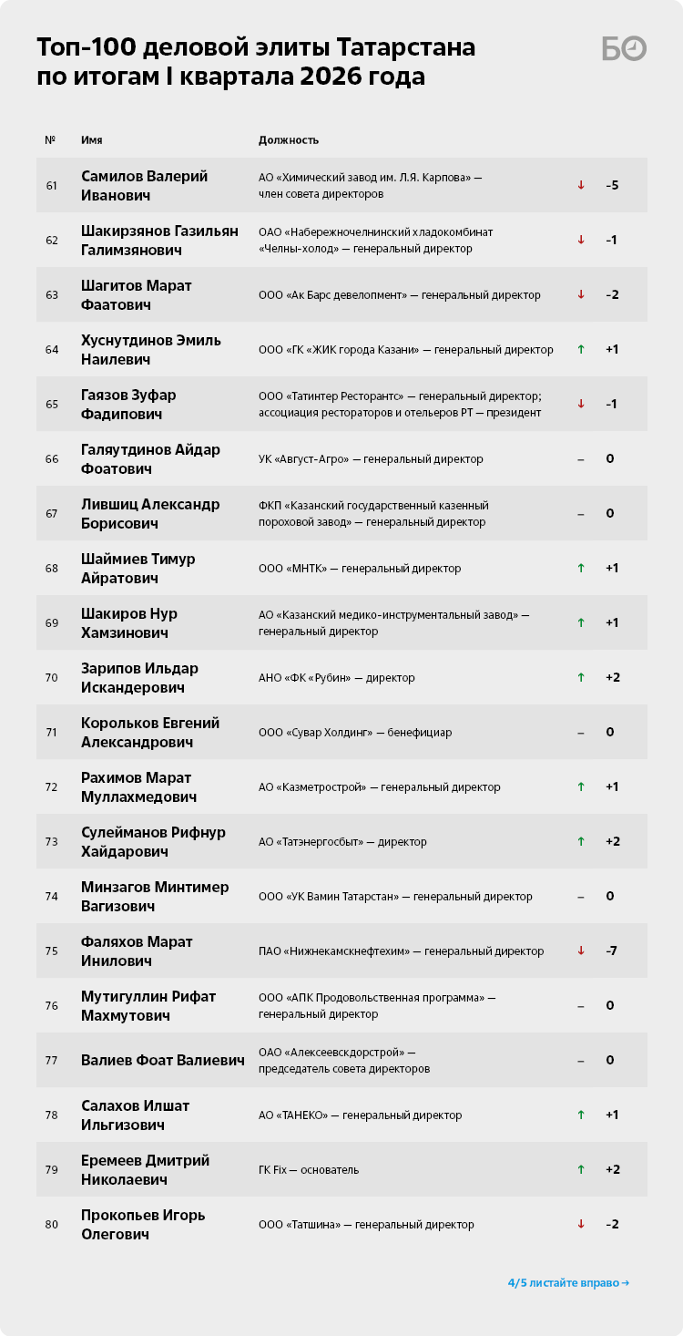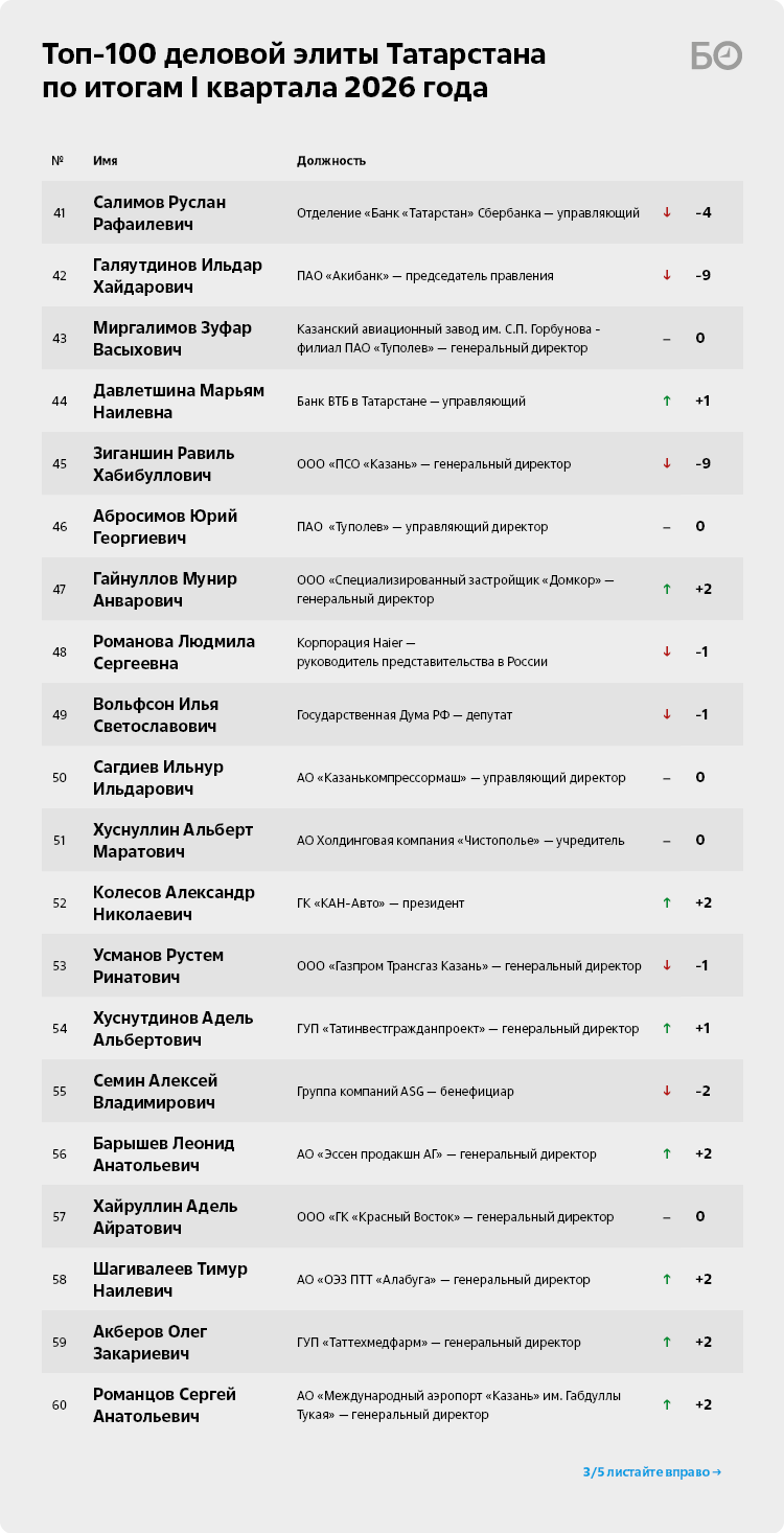 Гендиректор ПАО «КАМАЗ» Сергей Когогин продержался на вершине топ-100 деловой элиты РТ только один квартал, опустившись по итогам I квартала 2026-го сразу на 4-е место. Особо похвастаться нечем: рынок грузовиков падал два года подряд, по итогам 2025-го продажи вовсе сократились на 51% до 64 609 единиц. Борьба с засильем китайских производителей дала свои плоды: по итогам прошлого года наибольшее падение продаж показал Shacman — минус 70%, FAW просел на 62%, Sitrak — на 61%. Даже отечественный ГАЗ и белорусский МАЗ оказались в минусе — продажи сократились на 38% и 43% соответственно.