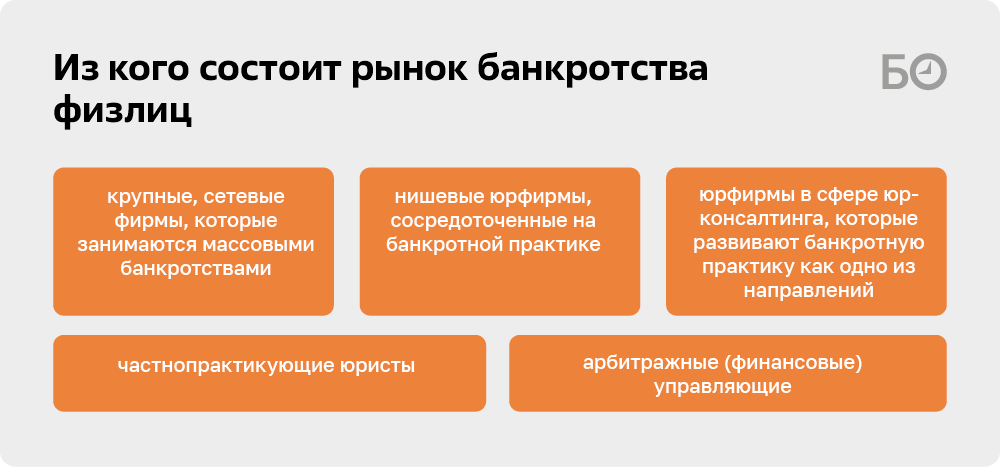 Арбитражных (финансовых) управляющих мы также включили в структуру рынка из-за того, что они вправе предоставлять консультации должникам, планирующим подать заявление о банкротстве, а также зачастую работают в партнерстве с юристами частной практики и юрфирмами. Консультации у управляющих хороши тем, что они знают кухню изнутри, им проще оценить перспективу движения банкротного дела.