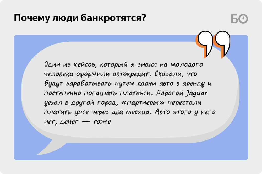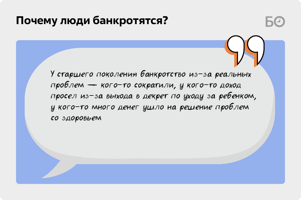 «Очень много молодых людей, которые целенаправленно идут в процедуру банкротства, — подтверждают и другие собеседники издания. — Они понимают, что им никогда не заработать на автомобиль, например. Берут кредиты через брокеров, покупают машину, записывают ее на другого человека — и все, в процедуру. Просто такая позиция: не хочу десятками лет копить на транспортное средство, не хочу работать. У старшего поколения такого нет. Банкротство у такой категории возникает из-за реальных проблем: кого-то сократили, у кого-то доход просел из-за выхода в декрет по уходу за ребенком, у кого-то много денег ушло на решение проблем со здоровьем. В таких случаях причины для объявления себя банкротом действительно очевидны».