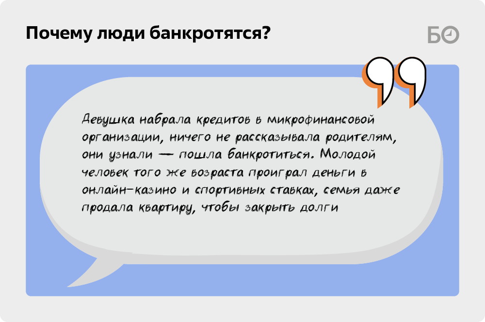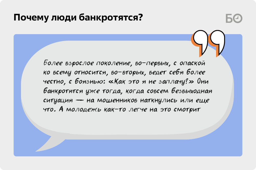 «Молодежь стала чаще банкротиться. У большинства из них нет финансовой грамотности, они не рассчитывают свои траты, берут кредит за кредитом, а потом не знают, как отдавать. Для некоторых банкротство кажется легким решением, о котором они уже наслышаны из интернета. А более взрослое поколение, во-первых, с опаской ко всему относится, во-вторых, ведет себя более честно, с боязнью: „Как это я не заплачу?“ Они банкротятся уже тогда, когда совсем безвыходная ситуация — на мошенников наткнулись или еще что. А молодежь как-то легче на это смотрит», — рассказывает арбитражный управляющий Екатерина Бурнашевская.