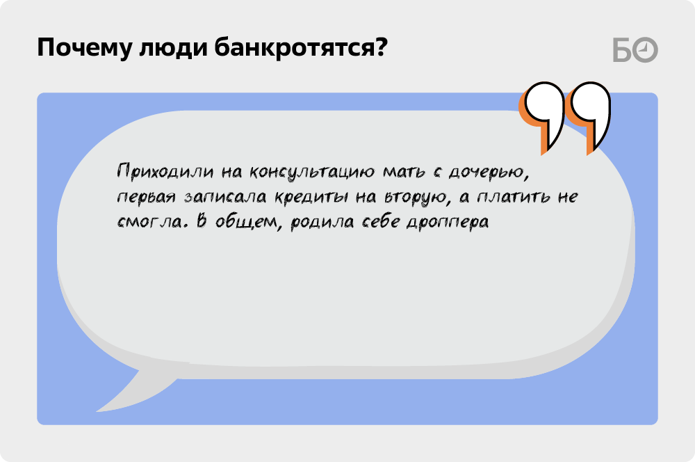 Часть молодых банкротов объективно могут винить в своем состоянии родителей — те записали на них свои кредиты. «Приходили на консультацию мать и дочь: первая записала кредиты на вторую, а платить не смогла. В общем, родила себе дроппера», — иронизируют юристы.