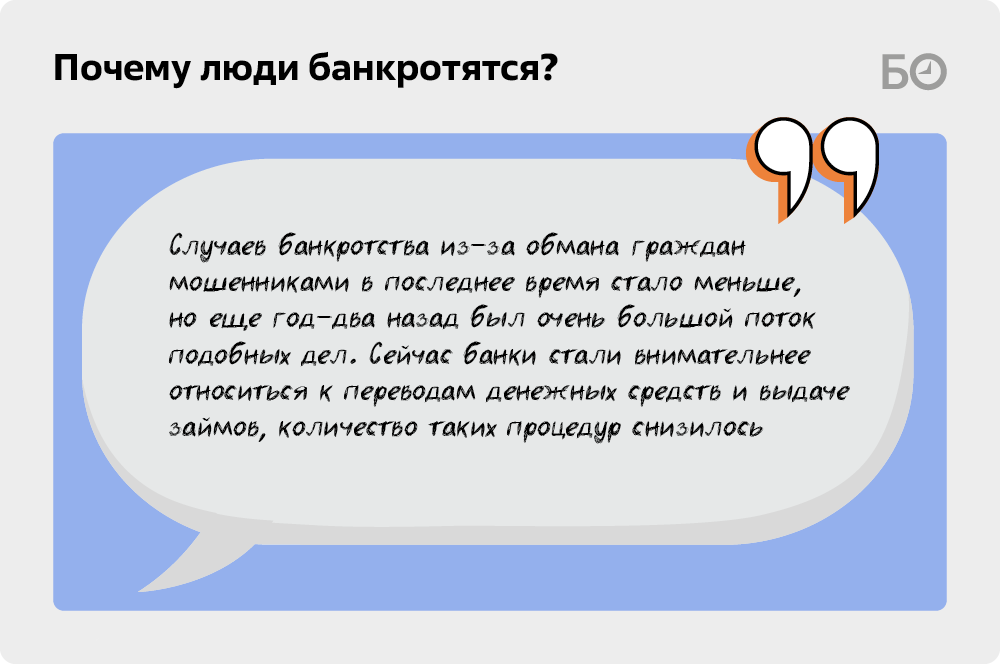 Бурнашевская также отмечает рост банкротств тех, кто пострадал из-за мошеннических действий. «Таких случаев в последнее время стало меньше, но еще год-два назад был очень большой поток подобных дел. Сейчас банки стали внимательнее относится к переводам денежных средств и выдаче займов — и количество таких банкротов снизилось», — рассказывает арбитражный управляющий.