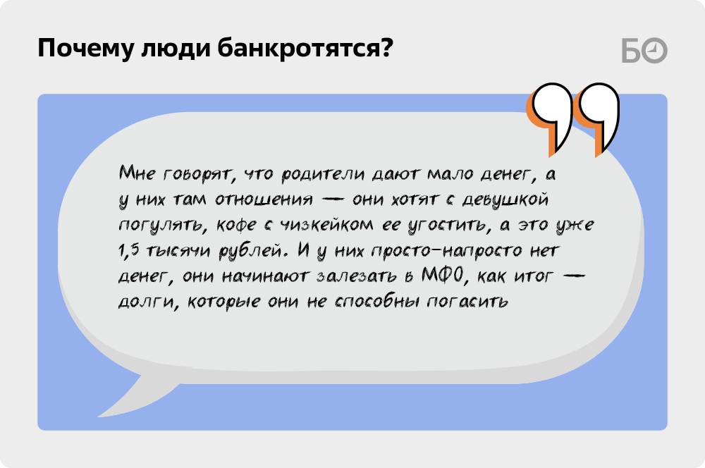 «В последнее время очень много консультаций берут молодые ребята. Я узнаю, с чем связано такое финансовое положение. Мне говорят, что родители дают мало денег, а у них там отношения — они хотят с девушкой погулять, кофе с чизкейком ее угостить, а это уже полторы тысячи рублей. И у них просто-напросто нет денег, они начинают залезать в МФО, как итог — долги, которые они не способны погасить. Если долги до 300 тысяч рублей, их зачастую закрывают родители. А если свыше, зумеры приходят на консультацию вместе с родителями, потому что уже невозможно терпеть звонки от коллекторов», — делится арбитражный управляющий Наиль Ризванов.