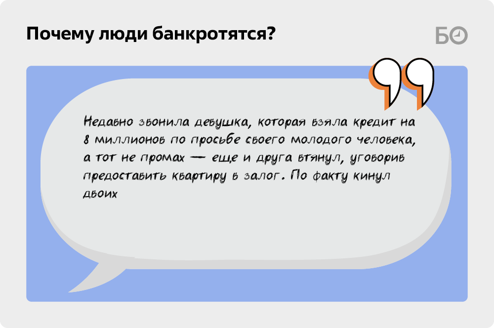 «Мне постоянно звонят девушки, которые взяли кредит для парня, а отношения закончились. Одна оформила автокредит на себя для молодого человека, который потом стал бывшим. Любовь прошла, долг остался. То же самое с поручительством: друг просит поручиться за кредит, обещает, что „сейчас темка выстрелит“ и он все погасит. Недавно звонила девушка, которая взяла кредит на 8 миллионов по просьбе бывшего парня, а тот не промах — еще и друга втянул, уговорив того предоставить квартиру в залог. По факту кинул двоих. Но другу досталось больше — он может остаться без жилья. На мой вопрос, зачем девушка взяла такой кредит, ответ был: „Любила“», — делится Дун.